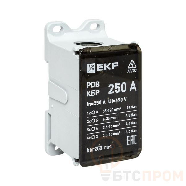 Блок распределительный клеммный КБР 250A от EKF (артикул: kbr250-rus) — это надежное и компактное решение для организации электропитания и распределения тока в различных электроустановках. Устройство рассчитано на номинальный ток до 250 А, что делает его идеальным для применения в промышленных сетях, распределительных щитах, а также в качестве вводного элемента для групп автоматов.