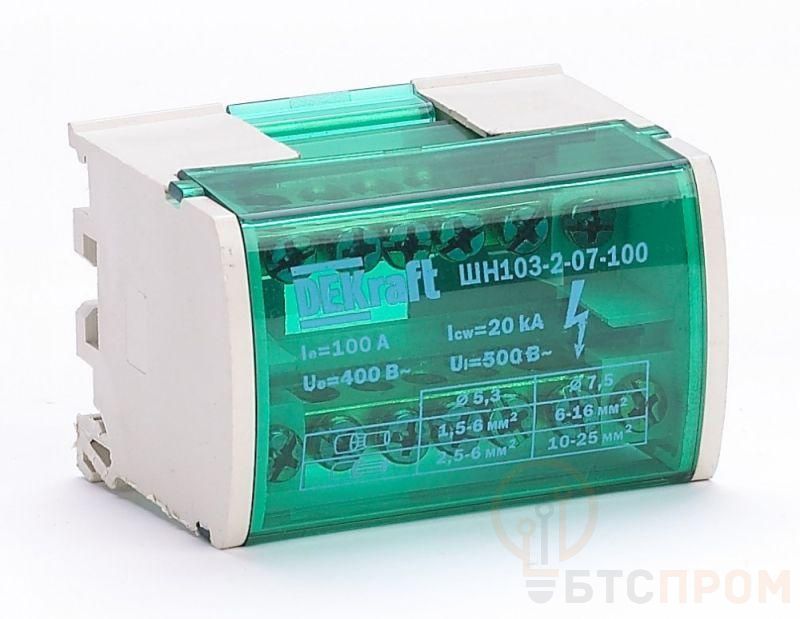 Кросс-модуль серии ШН-103 Dekraft; номинальный ток - 100 А; исполнение – 2 ряда по 7 отверстий (5х5,3 + 2x7,5); материал корпуса – нагревостойкий пластик; материал шин – высококачественная электротехническая бронза; каждая шина отдельно изолирована; цвет крышки – зеленый; установка – на DIN-рейку 35 мм или на монтажную панель двумя винтами M4; степень защиты - IP20. Применение кросс-модулей в щите обеспечивает компактную разводку кабелей и защиту от прикосновения к токоведущим частям.