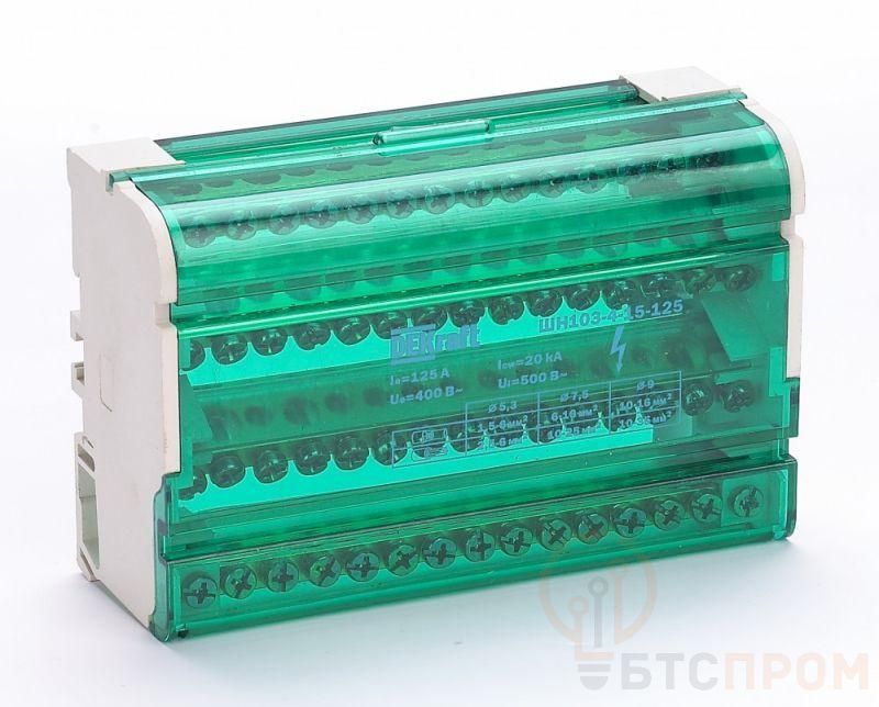Кросс-модуль серии ШН-103 Dekraft; номинальный ток - 125 А; исполнение – 4 ряда по 15 отверстий (11х5,3 + 2x7,5 + 2x9,0); материал корпуса – нагревостойкий пластик; материал шин – высококачественная электротехническая бронза; каждая шина отдельно изолирована; цвет крышки – зеленый; установка – на DIN-рейку 35 мм или на монтажную панель двумя винтами M4; степень защиты - IP20. Применение кросс-модулей в щите обеспечивает компактную разводку кабелей и защиту от прикосновения к токоведущим частям.