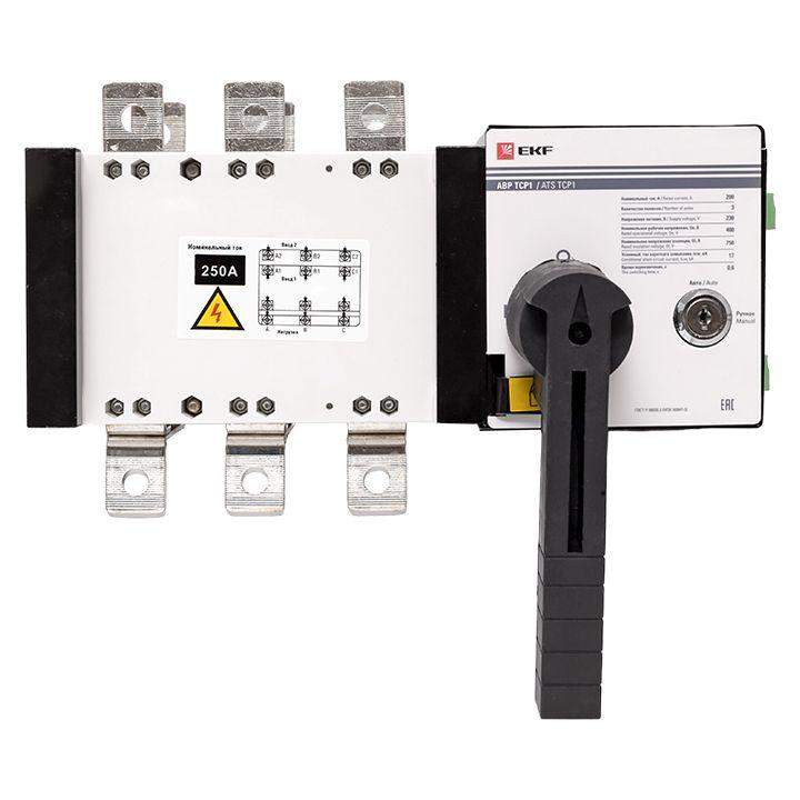 Устройство АВР торговой марки EKF предназначено для обеспечения резервным электроснабжением нагрузки, подключенной к системе электрообеспечения, имеющей основной и резервный вводы. Устройство АВР автоматически подключает резервную линию питания в случае пропадания напряжения на основной линии. Устройство АВР выполнено в виде моноблока и состоит из контактного блока и блока управления. На блоке управления имеется рычаг ручного переключения, замковый механизм перевода в ручной или автоматический режимы управления и запорный механизм, обеспечивающий блокировку переключения устройства АВР. АВР ТСР1 работает только по схеме электросеть-электросеть. Устройство АВР ТСР1 работает по схеме электросеть-электросеть. Для работы в режиме электросеть-генератор нужно подключить ДГУ к соответствующим контактам. Также контроль наличия напряжения осуществляется только по фазе А, не рекомендуется использовать данное устройство при необходимости контроля всех трёх фаз