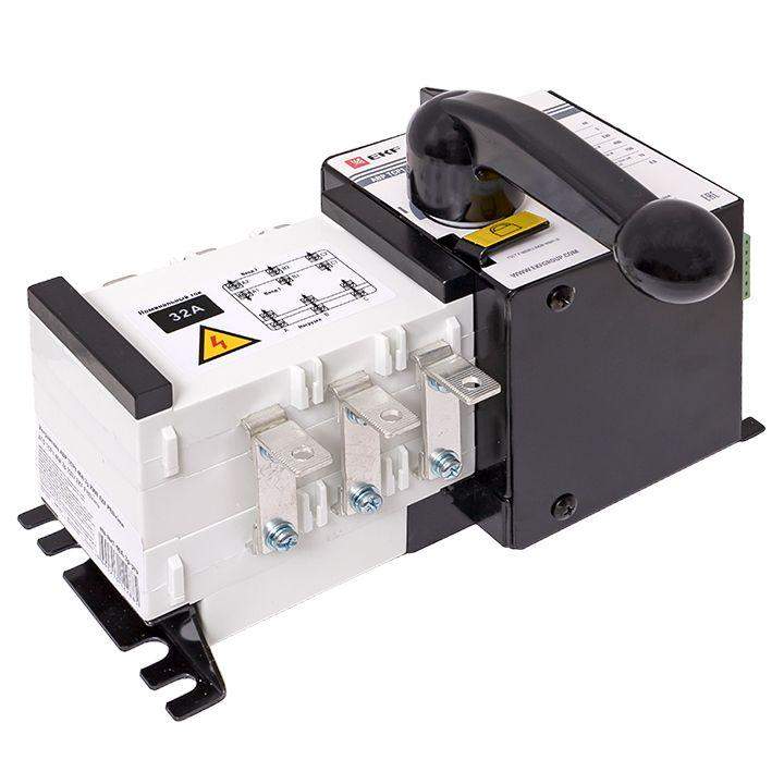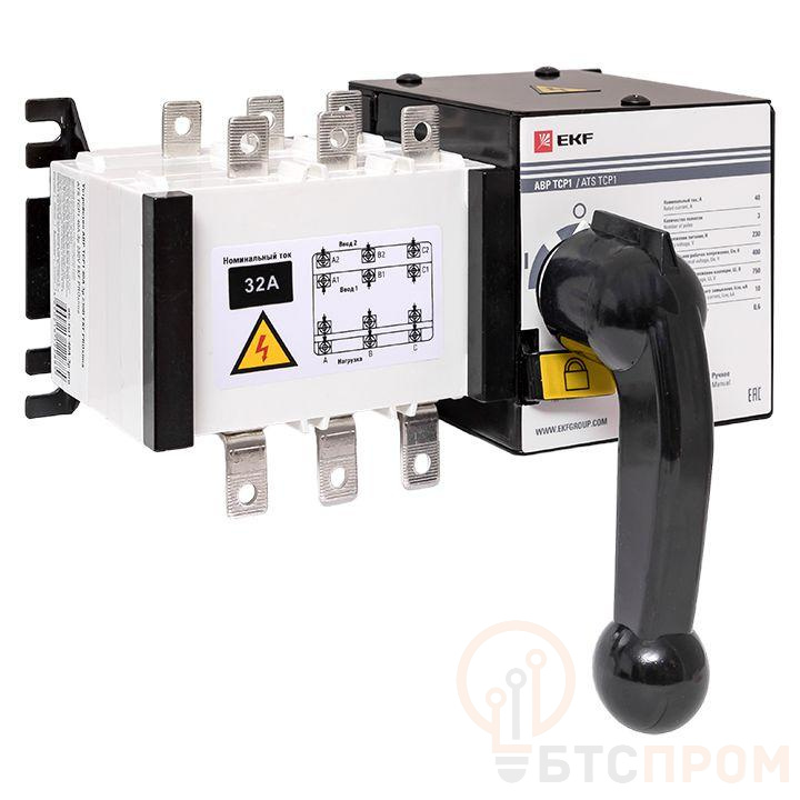 Устройство АВР торговой марки EKF предназначено для обеспечения резервным электроснабжением нагрузки, подключенной к системе электрообеспечения, имеющей основной и резервный вводы. Устройство АВР автоматически подключает резервную линию питания в случае пропадания напряжения на основной линии. Устройство АВР выполнено в виде моноблока и состоит из контактного блока и блока управления. На блоке управления имеется рычаг ручного переключения, замковый механизм перевода в ручной или автоматический режимы управления и запорный механизм, обеспечивающий блокировку переключения устройства АВР. АВР ТСР1 работает только по схеме электросеть-электросеть. Устройство АВР ТСР1 работает по схеме электросеть-электросеть. Для работы в режиме электросеть-генератор нужно подключить ДГУ к соответствующим контактам. Также контроль наличия напряжения осуществляется только по фазе А, не рекомендуется использовать данное устройство при необходимости контроля всех трёх фаз