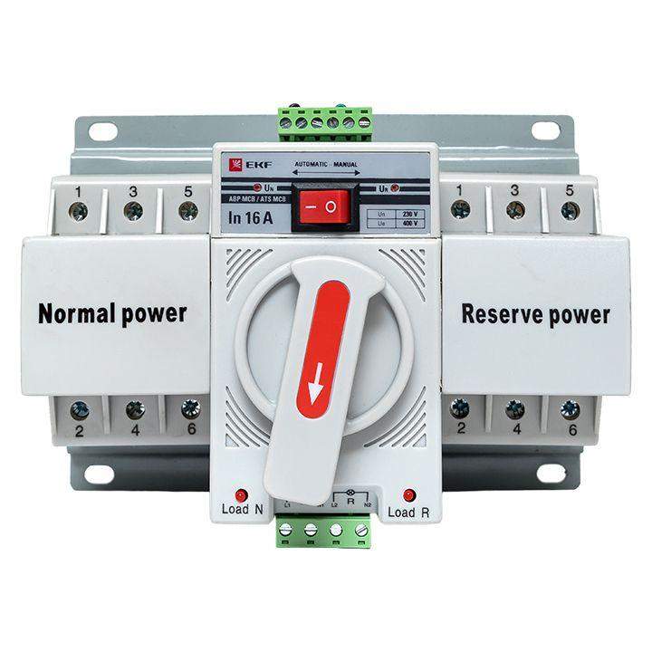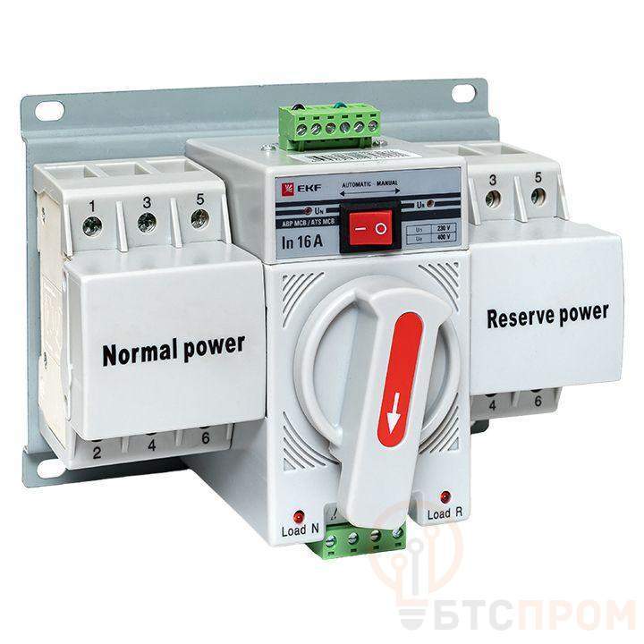 Устройство АВР EKF предназначено для обеспечения резервным электроснабжением нагрузки, подключенной к системе электрообеспечения, имеющей основной и резервный вводы. Устройство АВР автоматически подключает резервную линию питания в случае исчезновения напряжения на основной линии. Предназначен для трехфазных четырехпроводных (или однофазных однопроводных) систем двойного энергопитания переменного тока с частотой 50/60 Гц, номинальным напряжением 400 В/230 В и номинальным током до 63А. Устройство выполнено в виде моноблока и состоит из блока управления и двух модульных автоматических выключателей. На блоке управления имеется рычаг ручного переключения. Такая конструкция позволяет уменьшить габариты и площадь установки АВР.