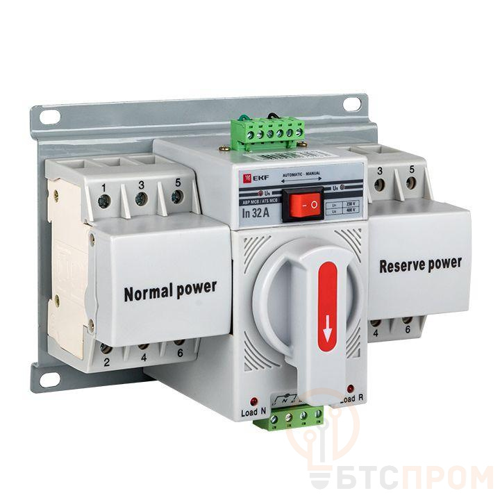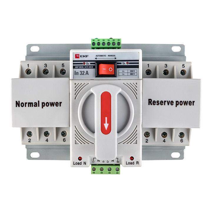 Устройство АВР EKF предназначено для обеспечения резервным электроснабжением нагрузки, подключенной к системе электрообеспечения, имеющей основной и резервный вводы. Устройство АВР автоматически подключает резервную линию питания в случае исчезновения напряжения на основной линии. Предназначен для трехфазных четырехпроводных (или однофазных однопроводных) систем двойного энергопитания переменного тока с частотой 50/60 Гц, номинальным напряжением 400 В/230 В и номинальным током до 63А. Устройство выполнено в виде моноблока и состоит из блока управления и двух модульных автоматических выключателей. На блоке управления имеется рычаг ручного переключения. Такая конструкция позволяет уменьшить габариты и площадь установки АВР.