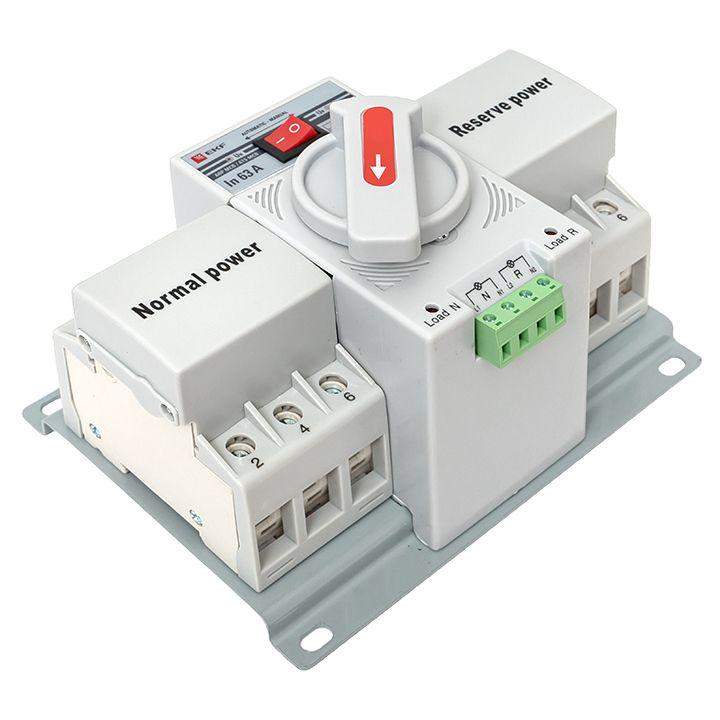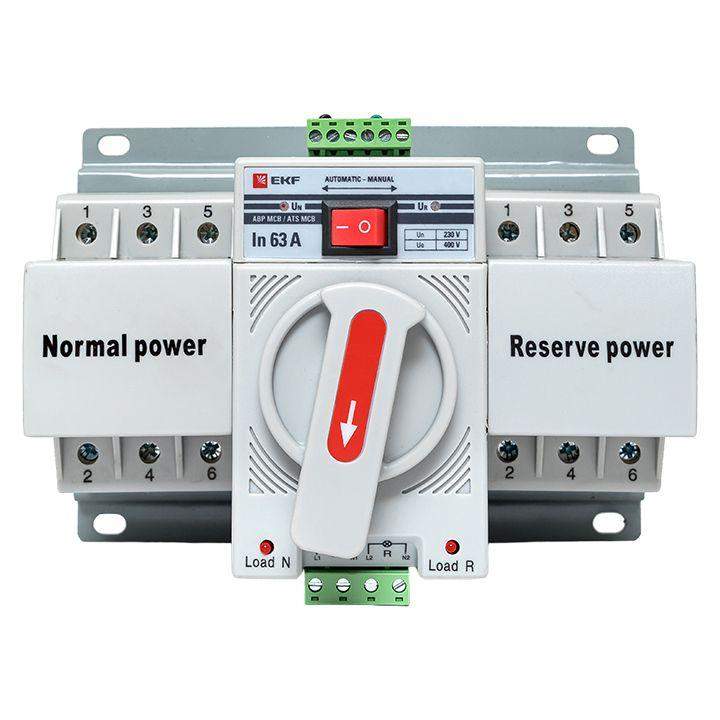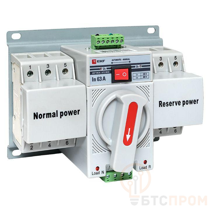 Устройство АВР EKF предназначено для обеспечения резервным электроснабжением нагрузки, подключенной к системе электрообеспечения, имеющей основной и резервный вводы. Устройство АВР автоматически подключает резервную линию питания в случае исчезновения напряжения на основной линии. Предназначен для трехфазных четырехпроводных (или однофазных однопроводных) систем двойного энергопитания переменного тока с частотой 50/60 Гц, номинальным напряжением 400 В/230 В и номинальным током до 63А. Устройство выполнено в виде моноблока и состоит из блока управления и двух модульных автоматических выключателей. На блоке управления имеется рычаг ручного переключения. Такая конструкция позволяет уменьшить габариты и площадь установки АВР.