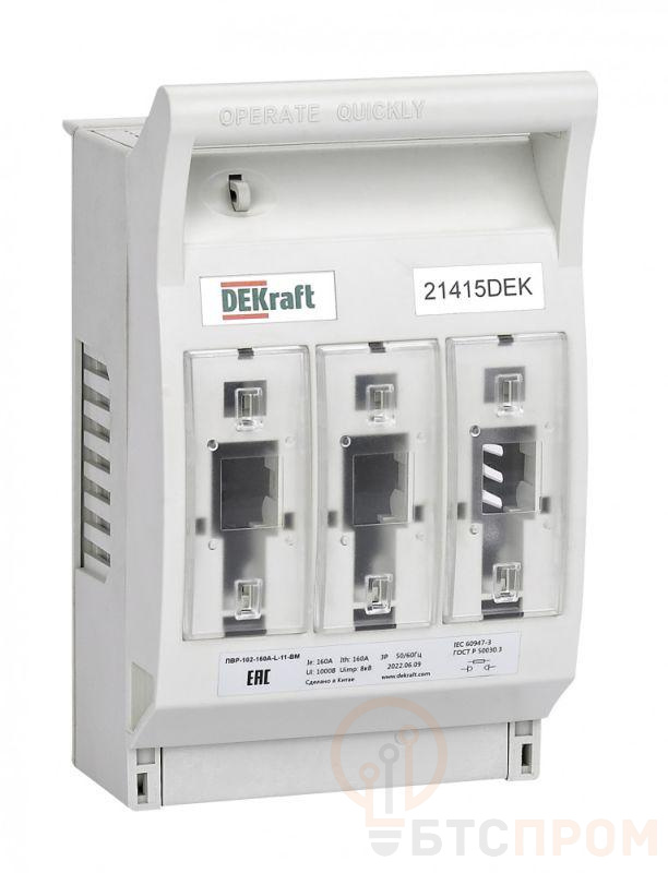 Предохранитель-выключатель-разъединитель горизонтальный 160А 3ф отключение 1НО+1НЗ навесной монтаж на шину ПВР-102 DEKraft 21410DEK