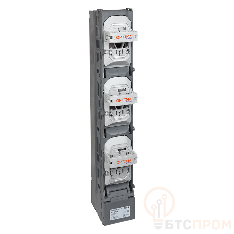 Предохранитель-выключатель-разъединитель 3 полюсный переменного тока на номинальный ток 630 А, со способом установки на шины и межшинным расстоянием 185 мм, имеющий пофазный способ коммутации.