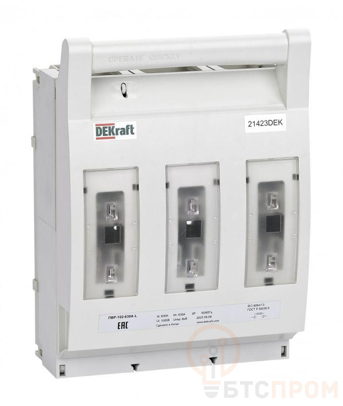 Предохранитель-выключатель-разъединитель горизонтальный (ПВР-102) предназначен для включения и отключения нагрузки с видимым разрывом в сетях трехфазного переменного тока до 630 А частотой 50/60 Гц и номинальным напряжением до 690 В. Трехфазное отключение, монтаж на монтажную плату.