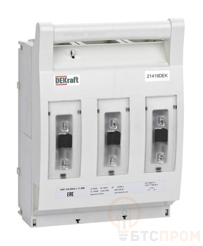 Выключатель-разъединитель-предохранитель ПВР горизонт. 800А 3ф отключ. 1НО+1НЗ навесной монтаж на шину ПВР-102 DEKraft 21419DEK