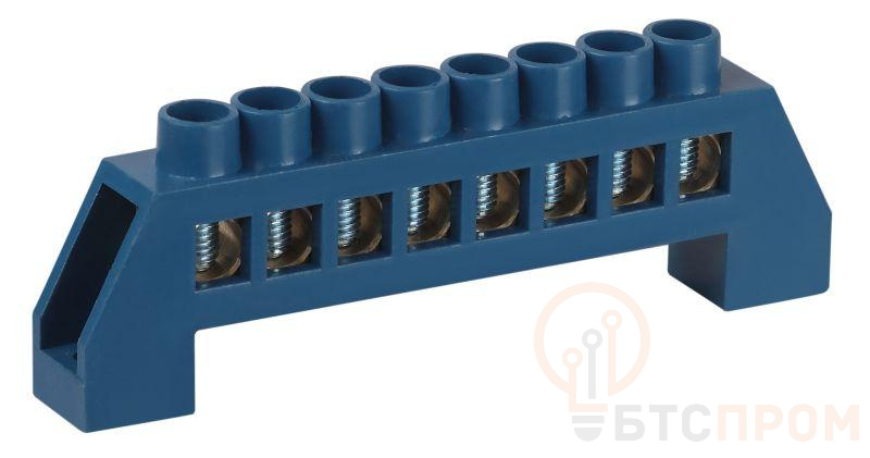 Нулевые шины N предназначены для электрического и механического соединения нулевых проводников. Является проводником, который служит для возврата к источнику остатка напряжения в стандартном случае или выравнивания потенциала в трёхфазной сети. Изделие выполнено из латунной шины сечением 8?12 мм установленной в пластиковый изолятор синего цвета.