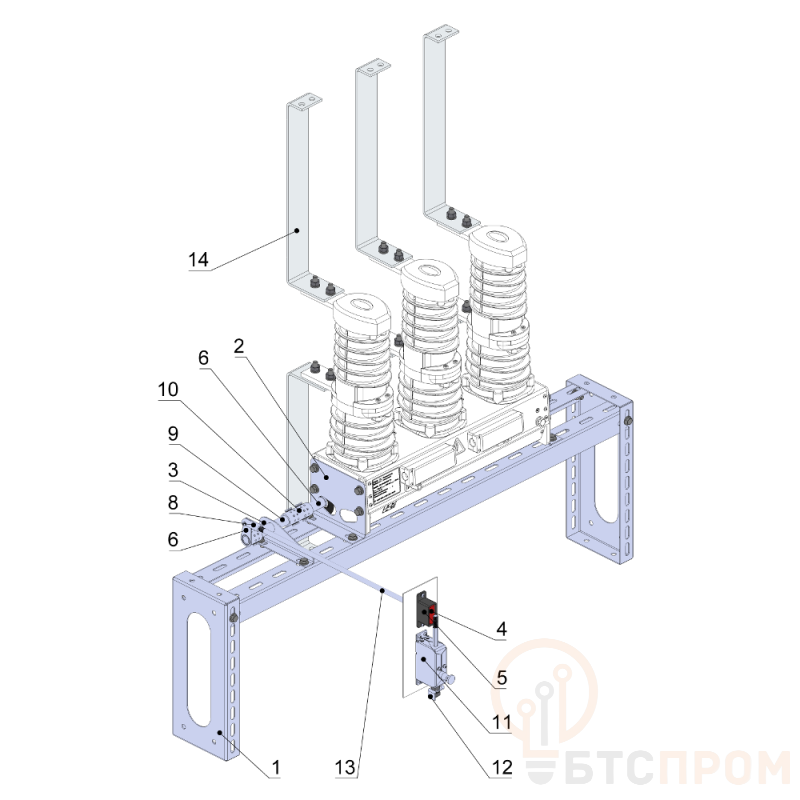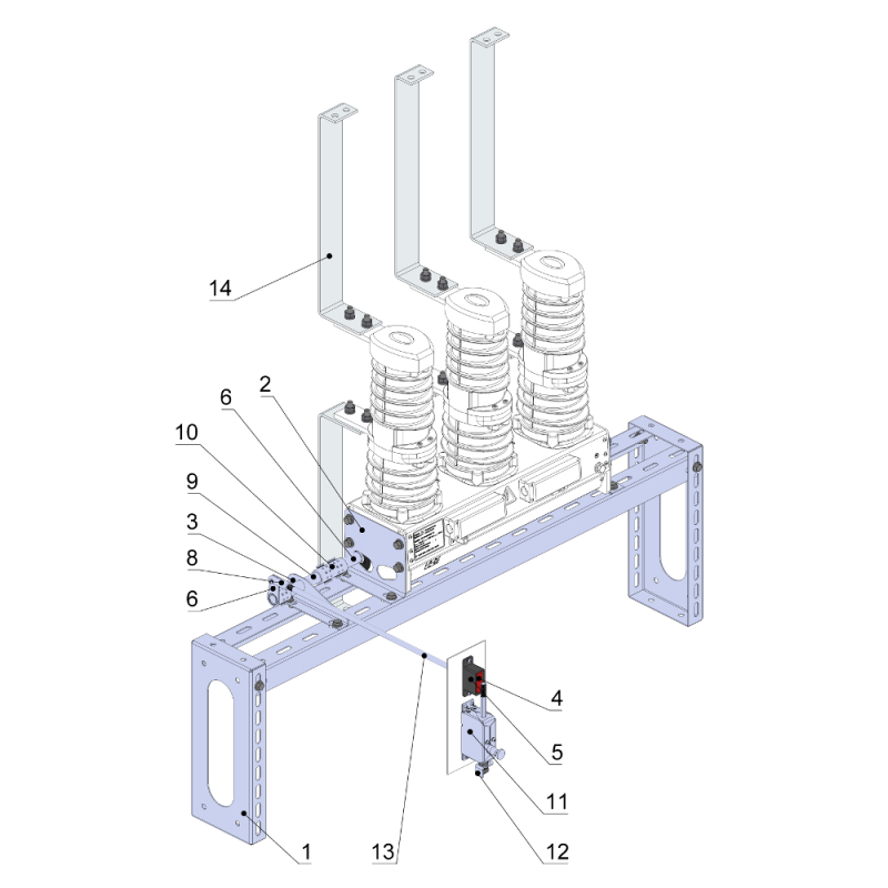 Комплект адаптации для ячеек КСО-2У, КСО-2УМ, КСО-2200 с применением электро-механической блокировки На рисунке отображено: 1 - кронштейн; 2 - уголок; 3 - вал; 4 - втулка; 5 – OptiMat BB; 6 – рычаг; 7 – узел блокировочный.