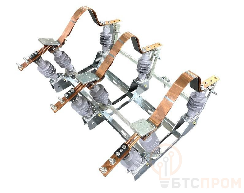 Разъединитель НИЛЕД РЛК-1Б-10-IV/400 УХЛ1 с приводом ПР-01-7 УХЛ1 (ПР-У-01 УХЛ1) с КМЧ (6200) выполнен в виде трехполюсного аппарата качающегося типа. Каждый полюс имеет две неподвижные колонки, установленные на раме разъединителя, и одну подвижную колонку, установленную на поворотном кронштейне, которая имеет возможность качаться в направлении продольной оси разъединителя.