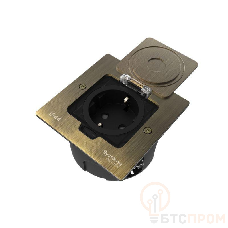 Лючок MultiDesk MDK21 с розеткой 2P+E 16А 250В IP44 с монтажной коробкой для стены фальшпола стола античная латунь SE MDK21102BA