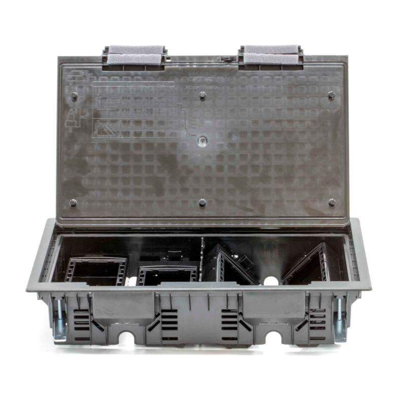 Назначение: организация рабочих мест в помещениях с открытым пространством. Устанавливается в фальшпол (толщина плит 20-45 мм). Отверстие для монтажа 218х335 мм. Глубина монтажа от 73 до 108 мм. Крышка открывается под углом 110?, предусмотрен монтаж напольного покрытия толщиной до 8 мм. Крышка усилена стальным листом, нагрузка: на малую площадь - 2000Н, на большую площадь - 3000Н (ГОСТ 61084-2-2-2022), допустимая нагрузка на крышку 450 кг (ГОСТ 61084-2-2-2007). Ручка с запорным механизмом. Возможна установка ЭУИ "Viva", "Avanti". Монтаж в 4 подрозеточных блока на 4 модуля каждый. Комплект поставки: лючок 16 модулей; основание и дно подрозеточного блока 4 модуля – 4 компл.; винт M4x35 – 4 шт.; крепежный эл. 4 шт. – 1 уп. Каркасы и рамки для ЭУИ заказываются дополнительно. Цвет - черный.