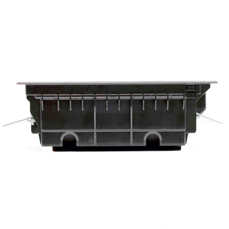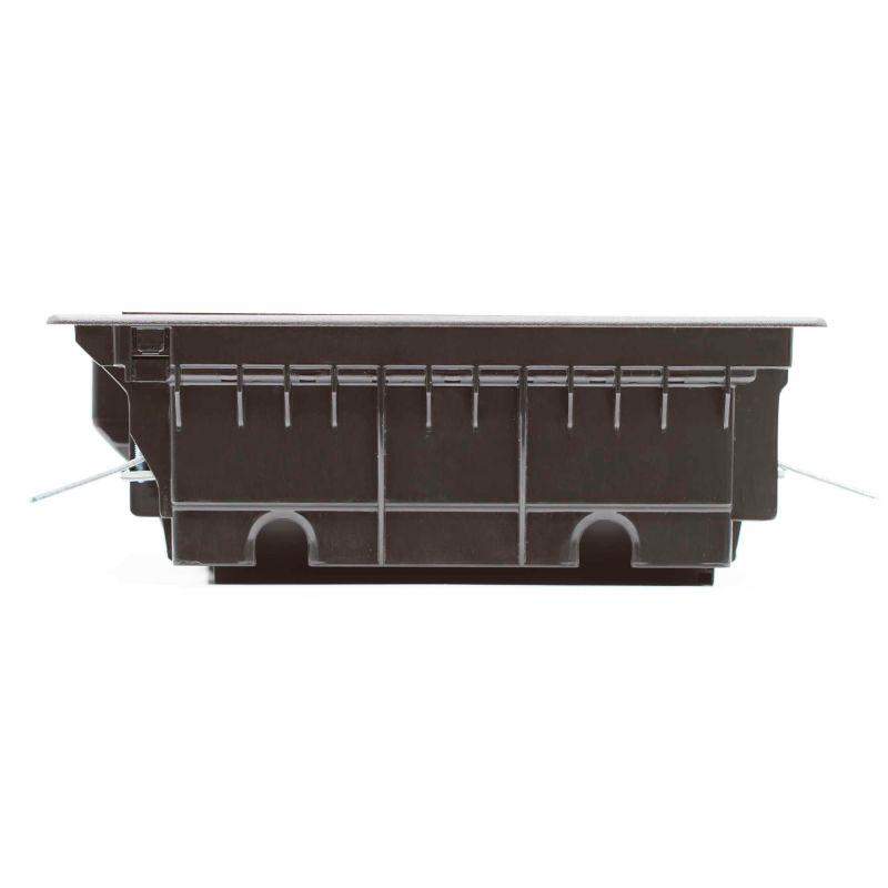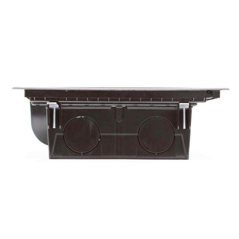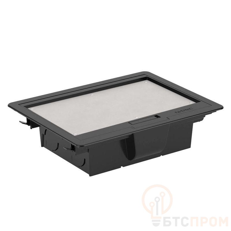Назначение: организация рабочих мест в открытом интерьере. Устанавливается в фальшполах (толщина плит 20-40 мм), отверстие в полу 345х255 мм, закрепляется невыпадающими фиксаторами. Характеристики: глубина от уровня пола - 92 мм, высота над уровнем пола (толщина рамки): 3 мм, ширина рамки (ободка по периметру) сверху – 20 мм, снизу – 12 мм, крышка лючка утоплена на 7,5 мм для напольного покрытия, крышка со стальным листом, нагрузка: на малую площадь - 1000Н, на большую площадь - 2000Н (ГОСТ 61084-2-2-2022), допустимая нагрузка на крышку 450 кг (ГОСТ 61084-2-2-2007), открывается на угол 110°; В лючок возможна установка ЭУИ "Avanti","Brava", "Viva", стандарта 45х45 мм с 2 сторон; трубы вводятся диаметром до 40 мм по 2 шт. с 2 сторон. Комплект поставки указан в инструкции. Цвет - черный.