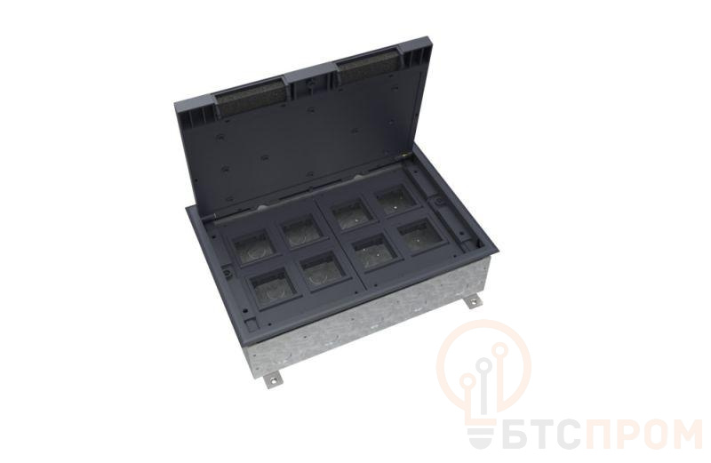 MultiDesk Лючок предназначен для установки в бетонный пол. Монтажная стальная коробка идёт в комплекте. В лючок можно установить до 16 модулей (8 постов) ЭУИ стандарта 45 мм, например, модульные ЭУИ W45. Лючок выполнен из пластика и имеет степень пылевлагозащиты IP40 при закрытой крышке, механическая стойкость - IK10. Сторону открывания крышки лючка можно менять. Имеется регулировка лючка по высоте - от 83 до 129 мм. Крышка лючка усилена металлической пластиной. Поставляется без ЭУИ.