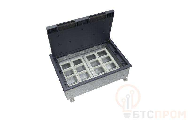 MultiDesk Лючок предназначен для установки в бетонный пол. Монтажная стальная коробка идёт в комплекте. В лючок можно установить до 24 модулей (12 постов) ЭУИ стандарта 45 мм, например, модульные ЭУИ W45. Лючок выполнен из пластика и имеет степень пылевлагозащиты IP40 при закрытой крышке, механическая стойкость - IK10. Сторону открывания крышки лючка можно менять. Имеется регулировка лючка по высоте - от 83 до 129 мм. Крышка лючка усилена металлической пластиной. Поставляется без ЭУИ.