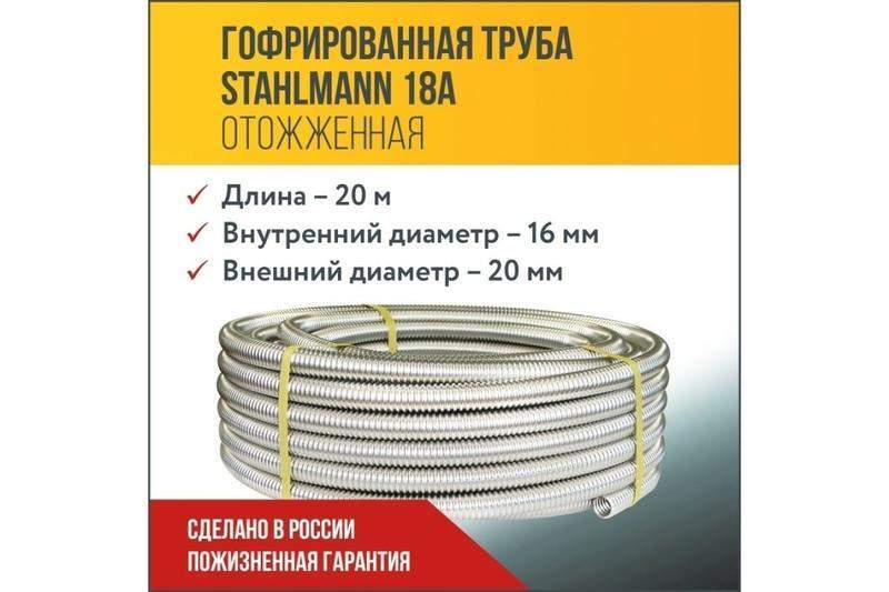 Гофрированная труба Stahlmann из нержавеющей стали SS304 18А, отожженная 20м 2217451 отожженная - это гофрированная труба из нержавеющей стали высочайшего качества. Типоразмер: 18А Диаметр: наружный 20 мм внутренний 16 мм Трубы водопроводные гофрированные Stahlmann широко применяются для изготовления гибких подводок для водопотребляющего оборудования. Гибкие подводки из гофрированных труб Stahlmann обеспечивают надежное и герметичное соединение с высокой надежностью и длительным сроком службы. Труба водопроводная Stahlmann это гофрированная труба из нержавеющей стали высочайшего качества! Широко применяется при монтаже гибких подводок для водопотребляющего оборудования, газового оборудования, водяных теплых полов, систем пожаротушения, кондиционирования и вентиляции, а также в формате кабель-каналов для дополнительной защиты силовых и слаботочных кабелей от внешних воздействий. Гибкие подводки из гофрированных труб гарантируют герметичное соединение с высокой надежностью и длительным сроком службы. Труба 18А гофрированная Stahlmann не меняет проходного сечения на сгибах и при максимальной деформации, стойкая к гидроударам, не пропускает кислород, легко гнется и держит форму, и не боится перепадов температур! Повышенная устойчивость к агрессивным средам позволяет применять трубы для транспортировки промышленных жидкостей и газа.