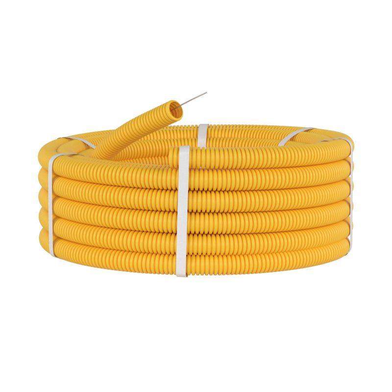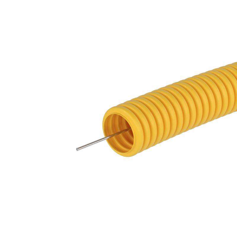Гибкая гофрированная труба из ПВХ надежно защищает кабель от механических воздействий. Используется для прокладки электрического, компьютерного телефонного кабелей. Труба этого типа прокладывается в стенных штробах, в пустотах фальш-потолков и фальш-стен, в стяжке полов или под фальш-полами. Проволочная протяжка облегчает прокладку кабеля в трубе. Диаметр - 20 мм. Материал – самозатухающий поливинилохлорид (ПВХ). Цвет - желтый. Гофрированные трубы из ПВХ легкой серии могут эксплуатироваться при температуре от – 25 °С до + 60 °С. Длина – 100 метров.