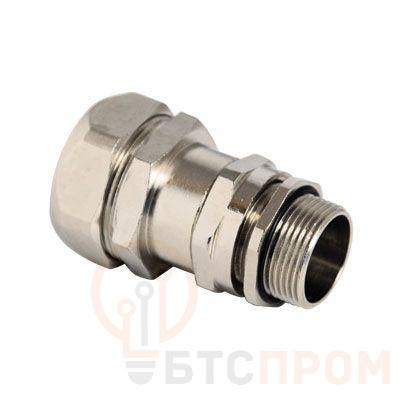Муфта металлорукав-коробка DN 40 М40х1,5 с уплотнением кабеля конструктивно представляет собой одновременно и муфту, и герметичный кабельный зажим. Аксессуар используется для герметичного (до IP 68) ввода металлорукава в корпус оборудования, распаечной коробки, щитка и т.п. Совместим с кабелем диаметром 20-27 мм.