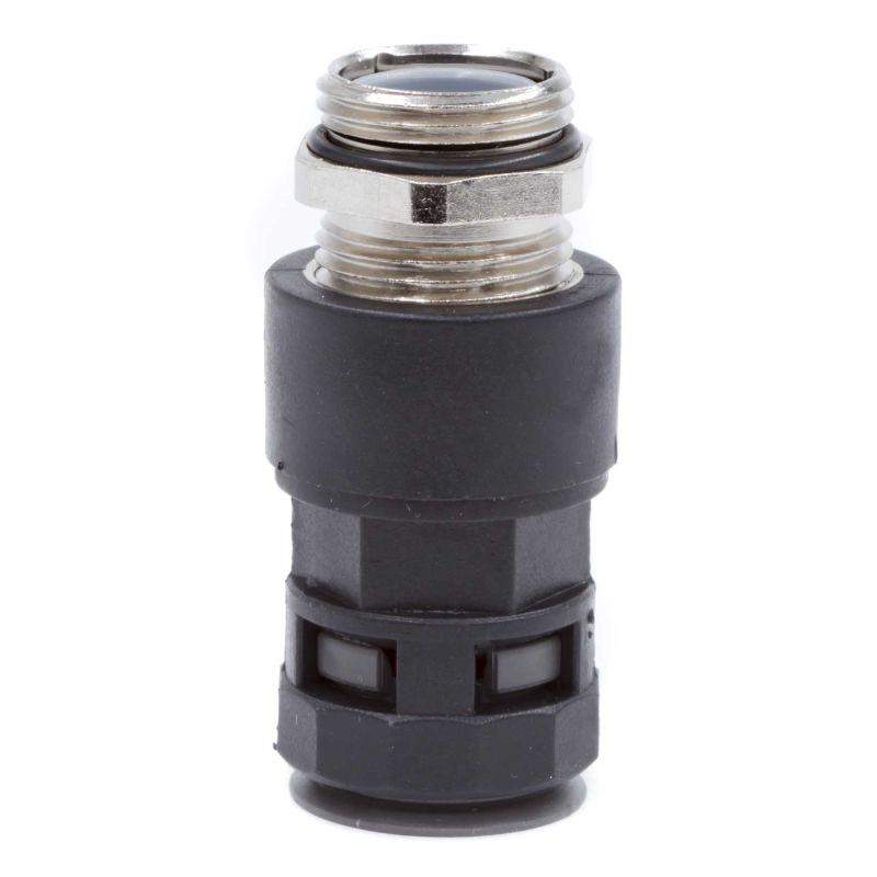 Муфта предназначена для ввода гофрированных полиамидных труб номинальным диаметром 10мм в корпуса шкафов, щитков, распаечных коробок, которые подвергаются механическим и вибрационным воздействиям в процессе эксплуатации. Металлическая резьба позволяет жестко зафиксировать муфту в оборудовании и не допустить разбалтывания соединения. Материал корпуса - полиамид, материал металлической резьбы - никелированная латунь. Не содержит галогенов. Фиксация муфты производится при помощи гайки 6006E-12 системы "Cosmec" от ДКС