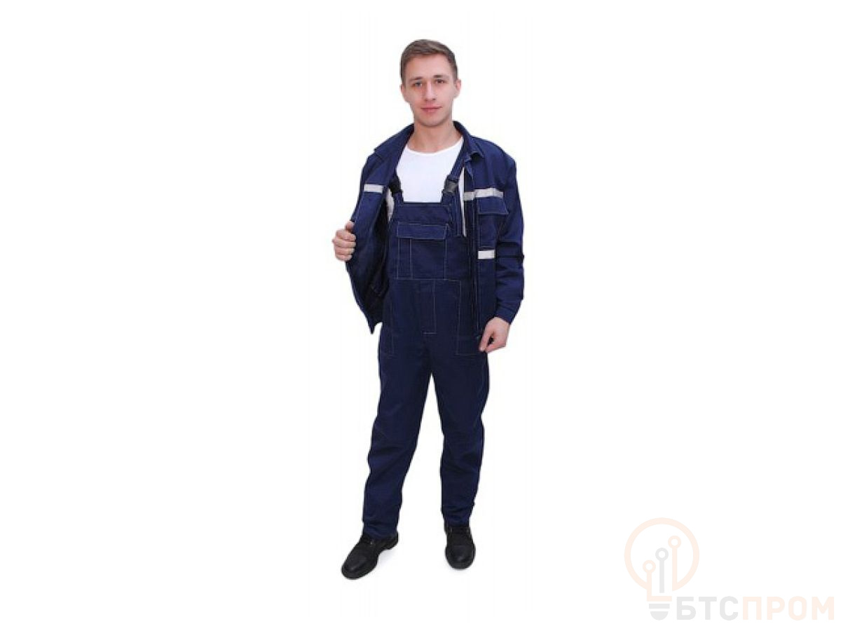 Куртка укороченная на поясе с супатной застежкой на пуговицы. Сверху два накладных кармана на клапанах, снизу два накладных с "косым" входом. Полукомбинезон с боковыми накладными карманами и накладным нагрудным карманом с клапаном. На костюме отделочная контрастная строчка. По линии кокетки и на карманах СОП 2,5 см.