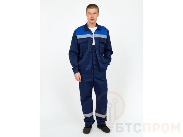 Костюм состоит из куртки и полукомбинезона. Куртка на поясе с центральной застёжкой на пуговице, нагрудные накладные карманы с клапанами, нижние накладные карманы с наклонным входом. Пояс с эластичной лентой на уровне боковых швов. На спинке и полочках по линии кокетки проложена светоотражающая лента шириной 5,0 см. Полукомбинезон с застёжкой гульф и застёжкой в боковом шве на петле и пуговице, боковые накладные карманы с наклонным входом, бретели частично с эластичной лентой и с застёжкой на фастексы, накладные карманы на передних и задних половинках брюк, отрезной нагрудник с накладным карманом под инструменты, ниже колен располагается светоотражающая лента шириной 5,0 см.