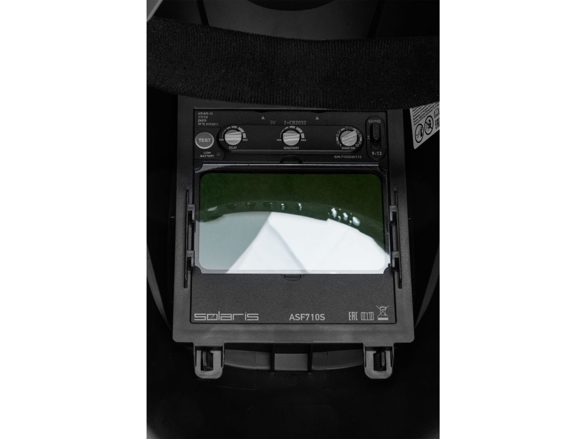 Щиток сварщика с самозатемняющимся светофильтром Solaris ASF710S (черный) (1/1/1/2, 100x60 мм (60 см2), DIN 4/5-8/9-13 (рег), шлифовка, рег.чувств.+задержки, 4 сенсора) SL5717-1