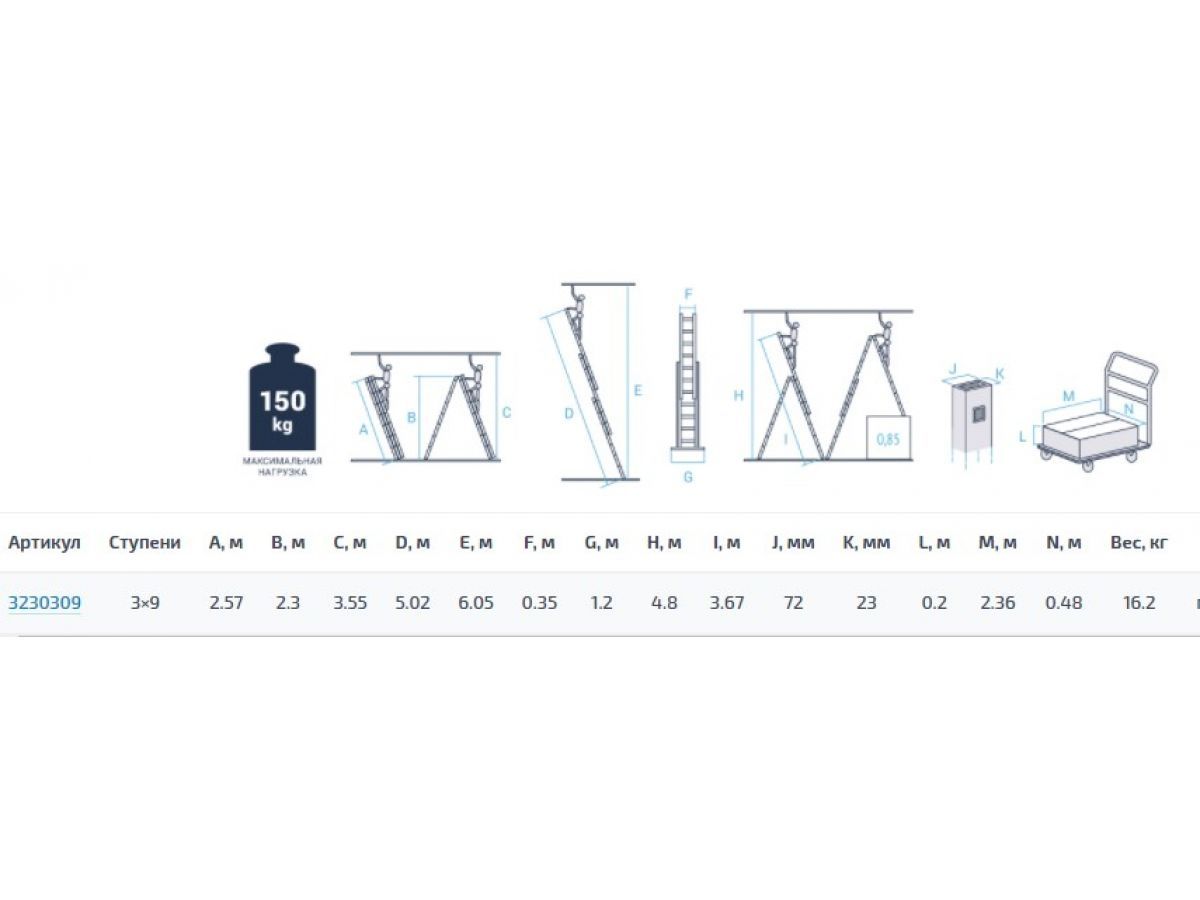 Лестница алюм. 3-х секц. 236/562/250 см 3х9 ступ. 15,9 кг NV3230 Новая Высота (макс. нагрузка 150кг) 3230309