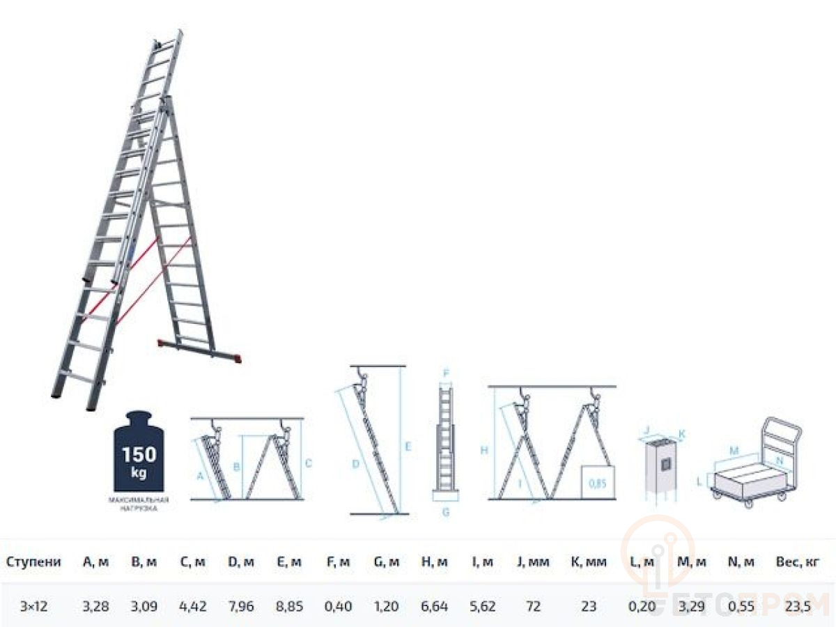 Лестница алюм. 3-х секц. 309/796/328см 3х12 ступ., 23,5кг NV5230 Новая Высота (макс. нагрузка 150кг) 5230312
