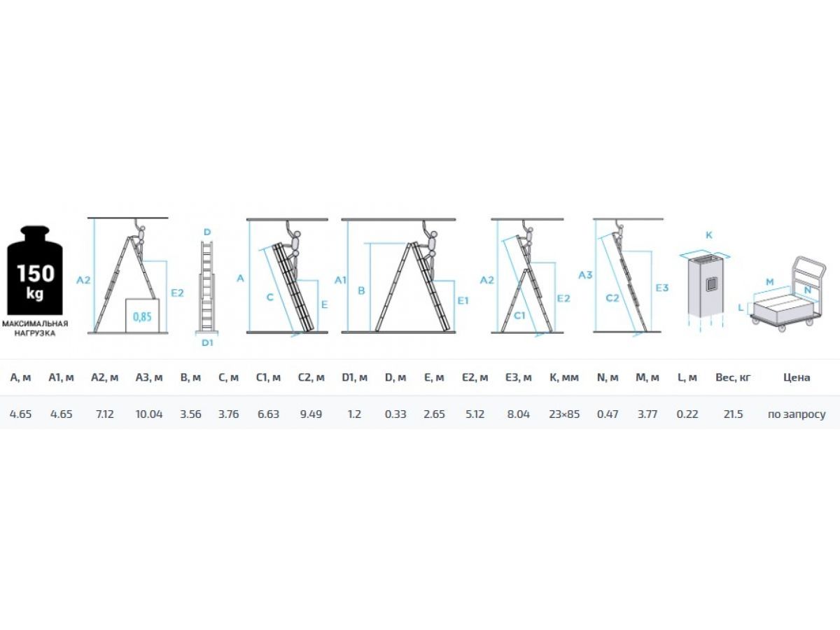Высота лестницы - 949см, высота стремянки - 356см, высота секции - 376см.
