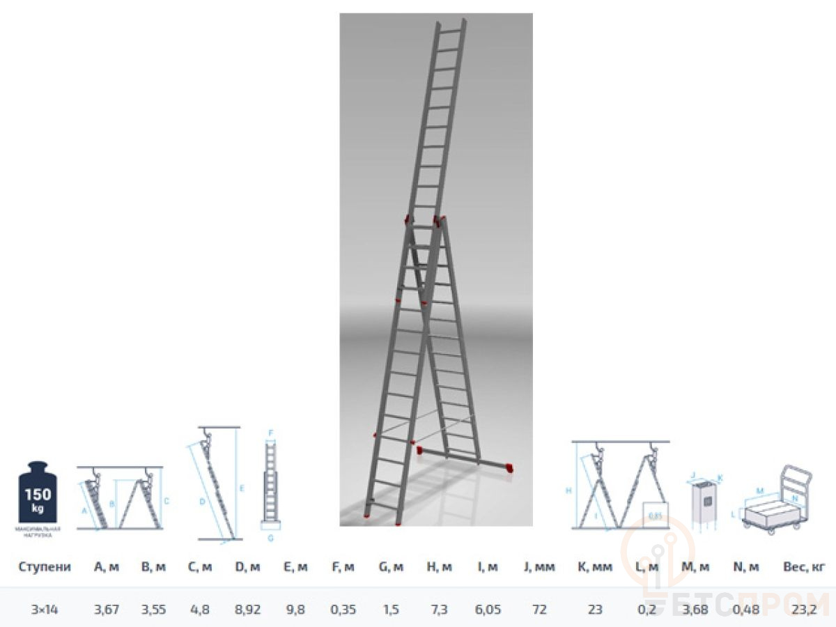Лестница алюм. 3-х секц. 358/926/380см 3х14 ступ., 23кг NV3230 Новая Высота (макс. нагрузка 150кг) 3230314