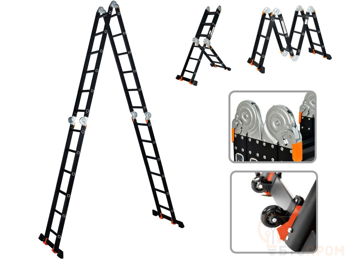 Лестница алюм. многофункц.4х6 ступ.(стрем.-332см,лестн.-690см) 17,0кг BLACK LINE STARTUL (ST9930-06) (усиленное шарнирное соединение, прорезиненные колеса и доп.стабилизаторы) ST9930-06