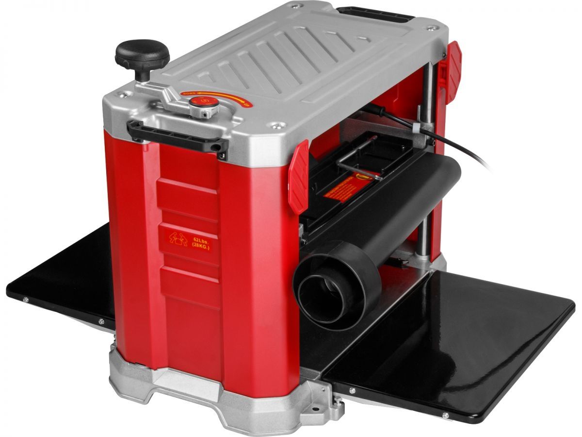 Станок оснащен двумя двухсторонними стальными ножами, подающими роликами, ручками для транспортировки, системой удаления опилок с возможностью подключения пылесоса.