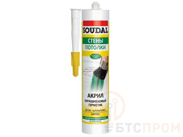 Герметик акриловый SOUDAL Акрил белый 280 мл (105877) - пластично-эластичный герметик на основе акриловой дисперсии. Обладает превосходной адгезией к пористым поверхностям: штукатурке, гипсовым и цементным поверхностям, бетону, камню, дереву, гипсокартону и т.д.