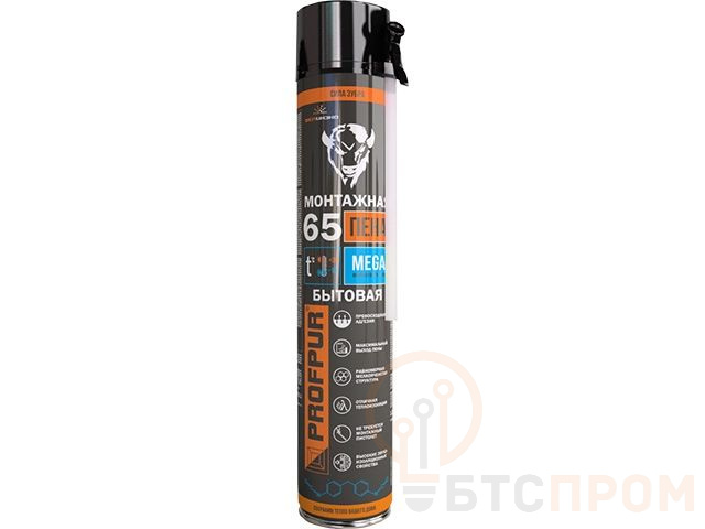 Пена монтажная PROFPUR Mega 870 мл (4814016008280) применяется для монтажа и уплотнения оконных и дверных блоков и других конструкций, для изоляции разводящей сети, уплотнения швов и трещин, заполнения различных пустот. Обладает прочным сцеплением со всеми естественными и синтетическими материалами кроме полиэтилена, силикона, тефлона. После застывания можно красить, штукатурить, оклеивать обоями. Превосходная формулы пены - хорошее первичное и низкое вторичное расширение, не дает усадки после затвердевания.