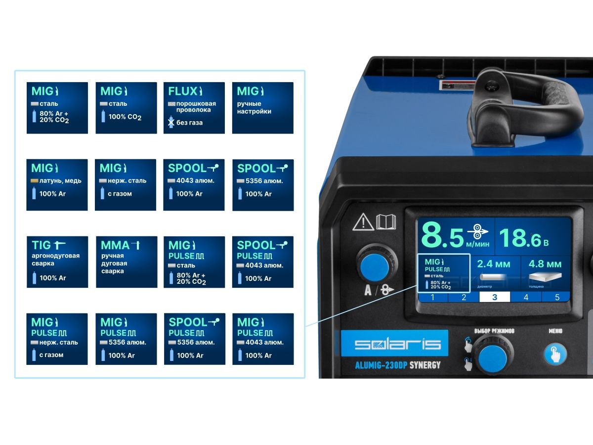 Полуавтомат сварочный Solaris ALUMIG-230DP SYNERGY (230В, MIG/SPOT/FLUX/MMA/TIG/PULSE/DP, синергетич.программы, евроразъем, горелка 3 м) SL1539-2