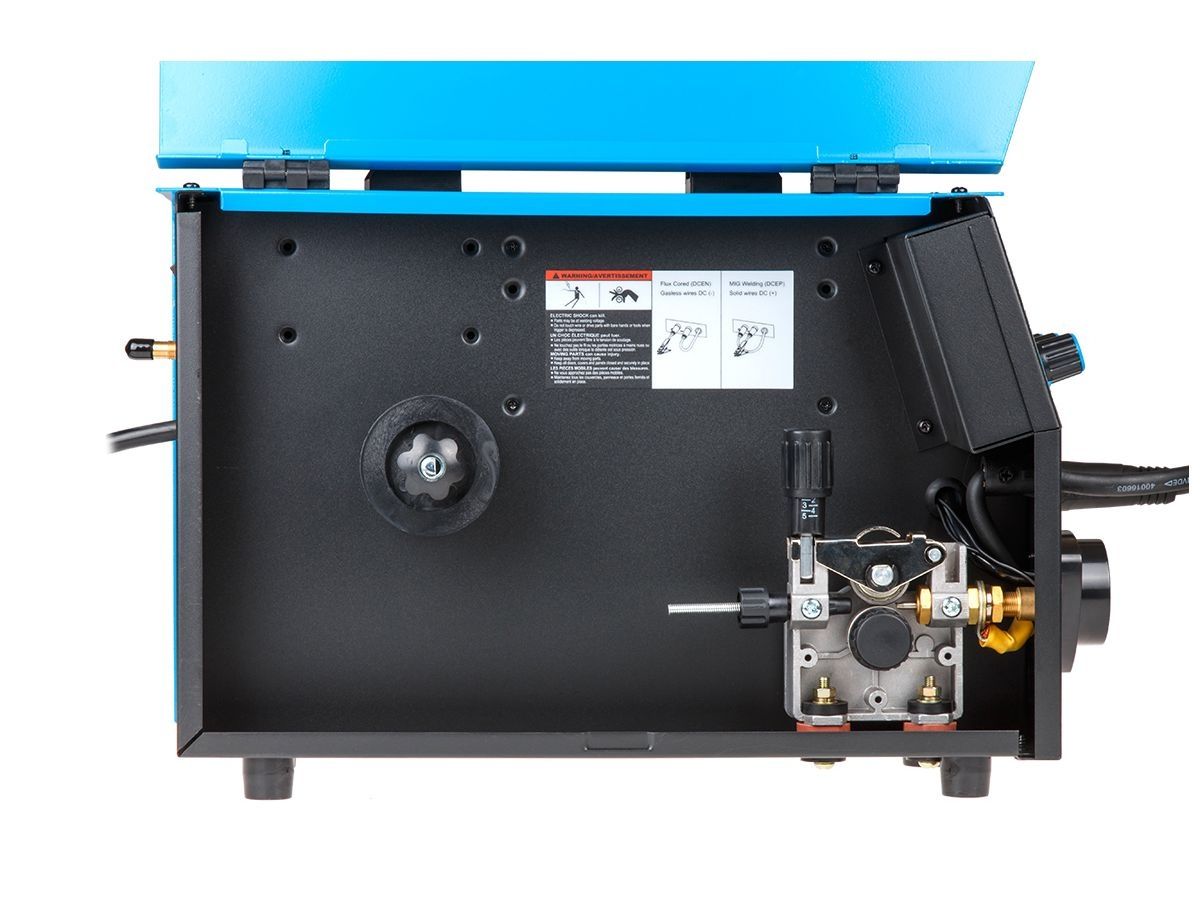 Аппарат оснащен евроразъемом для горелки, возможностью смены полярности для сварки проволокой без газа (FLUX).