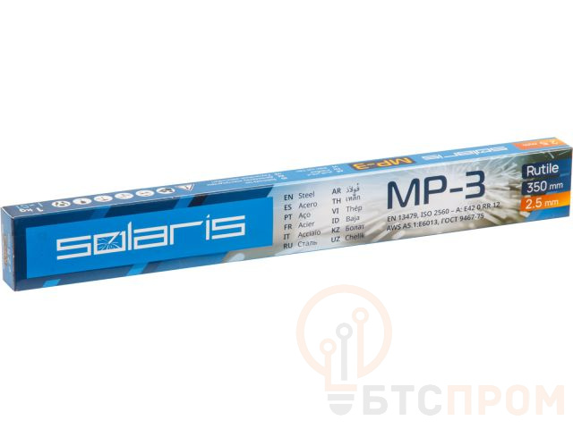 Универсальные сварочные электроды SOLARIS MP-3 с рутиловым покрытием для ручной дуговой сварки конструкций из углеродистых и низколегированных сталей на переменном сварочном токе (AC) или постоянном сварочном токе прямой (DC -) и обратной полярности (DC +) во всех пространственных положениях.
