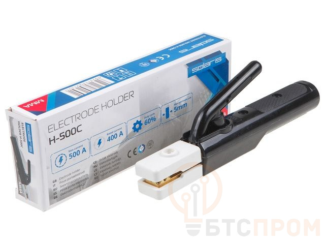 Электрододержатель - аксессуар для ручной дуговой сварки, который удерживает электрод во время проведения сварочных работ. Электрод можно установить в различных положениях: под углом 45, 90, 135 и 180 в зависимости от требуемых задач. Модель H-500C - оптимальный выбор для профессиональной эксплуатации. Удобство захвата, надежная фиксация электрода, оптимальные размеры и вес, качественные материалы - основные критерии при длительной эксплуатации электрододержателя.