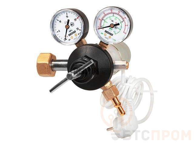 Регулятор расхода баллонный одноступенчатый предназначен для понижения и регулирования давления углекислого газа или аргона, поступающего из баллона, и автоматического поддержания постоянного рабочего расхода газа на выходе регулятора в ходе проведения работ. Подогреватель используется для предотвращения замерзания механизмов редуктора при больших расходах газа или при низких температурах окружающей среды. Подогрев осуществляется за счет теплообмена между газом и горячими стенками корпуса подогревателя.
