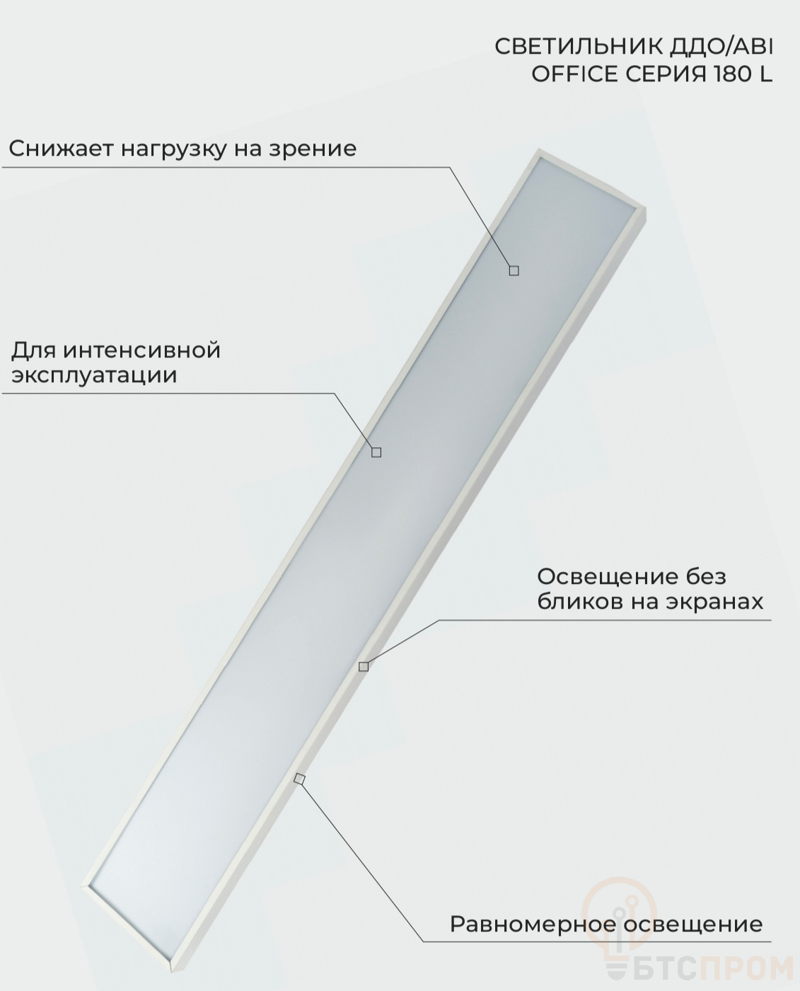 Светильник ДДО/ABI OFFICE 03 — современное энергоэффективное решение для основного освещения административных, коммерческих и образовательных пространств. Модель мощностью 24 Вт из серии 180 L обеспечивает качественный рассеянный свет без слепящего эффекта, что соответствует строгим требованиям к организации рабочих мест.