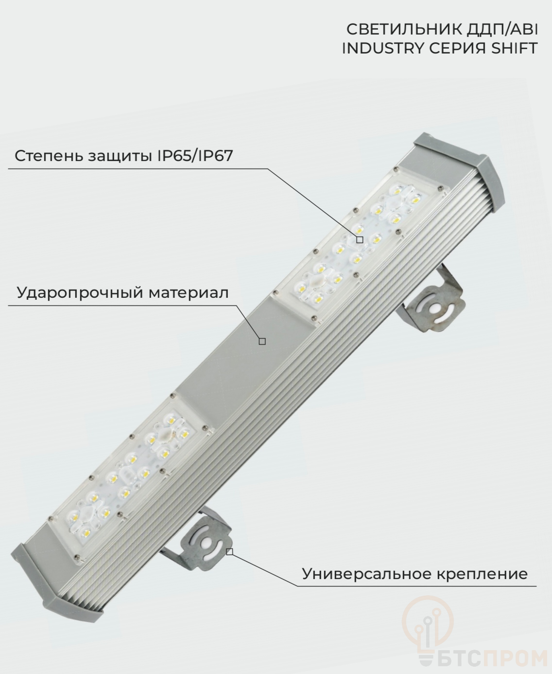 Корпус выполнен из ударопрочного поликарбоната, степень защиты IP65 гарантирует полную защиту от пыли и мощных струй воды. Светильник устойчив к вибрациям, перепадам температур и агрессивным средам, что делает его идеальным для сложных условий эксплуатации.