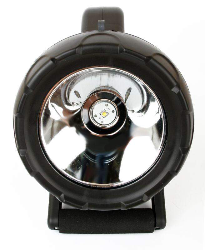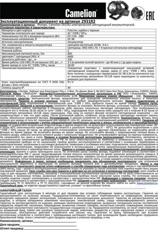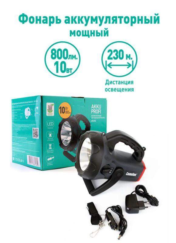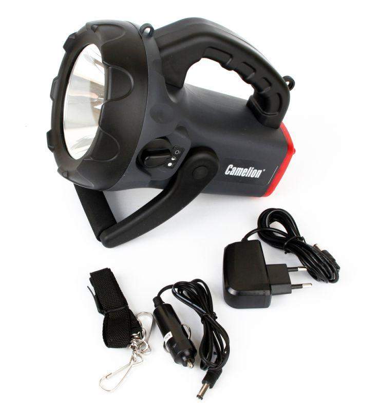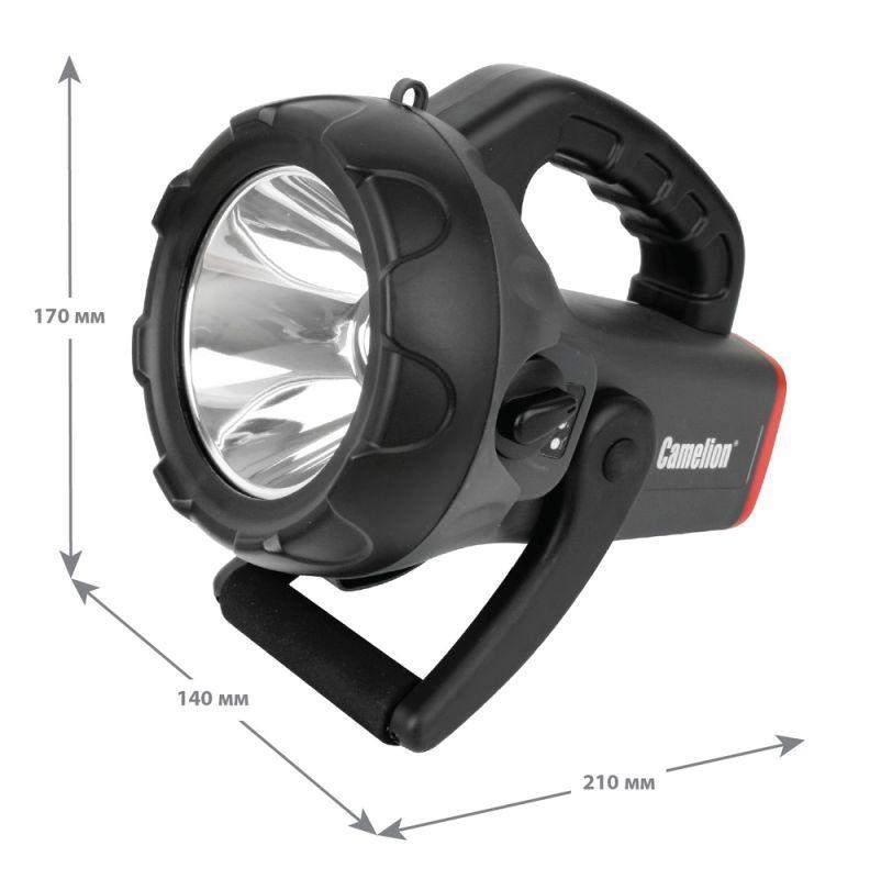 Фонарь Camelion электрический светодиодный аккумуляторный. Цвет корпуса - серый (carbon grey) с черным и красным. Материал корпуса - пластик. Источник света - светодиод XM-L T6 мощностью 10 ватт с цветовой температурой 6600К, со световым потоком 800 люмен. Дистанция освещения - до 230 метров. очень яркий, широкий и длинный луч. Дополнительное освещение: красные мигающие сигнальные светодиоды. Два режима работы. Выключатель - двухпозиционный тумблер. Время работы после полного заряда аккумулятора: светодиод XM-L T6 - до 3,5 часов, мигающие красные светодиоды - несколько суток. Время заряда 18 - 20 часов. Комплектация: фонарь, свинцово-кислотный аккумулятор с напряжением 4 В емкостью 4 А-ч, сетевой адаптер AC220 Вольт и автомобильный адаптер DC12 Вольт для заряда, поворотная подставка, упаковка, инструкция. Степень пыле-влаго-защиты IP44. Упаковка - коробка. Максимальный линейный размер фонаря 21 см. Размер упаковки 15 см x 17 см x 22 см. Вес без упаковки 1,3 кг. вес с упаковкой 1,52 кг.