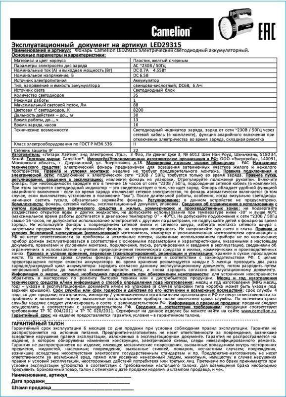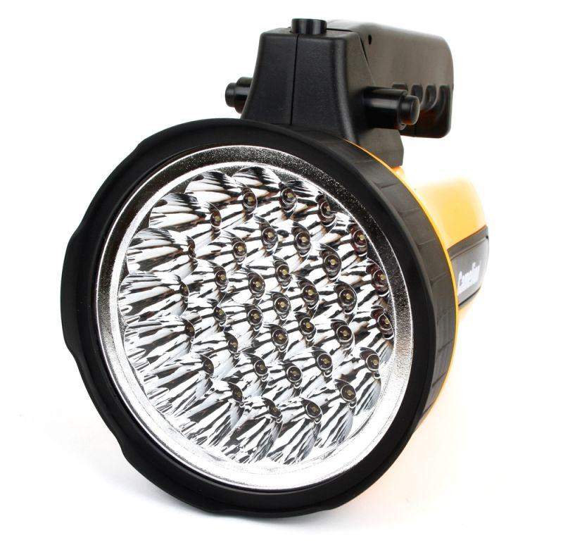 Фонарь Camelion электрический светодиодный аккумуляторный. Цвет корпуса - желтый с черным. Материал корпуса - пластик. Источник света - 35 светодиодов с цветовой температурой 8200К, максимальным световым потоком 88 люмен. Дистанция освещения - до 30 метров. Выключатель - кнопочного типа. Время работы при полностью заряженном аккумуляторе: до 12 часов. Время заряда - 16 часов. Дополнительные возможности - режим аварийного включения при выключении сетевого электричества во время заряда. Комплектация: фонарь, свинцово-кислотный аккумулятор с напряжением 6 В емкостью 4 А-ч, светодиодный индикатор заряда, сетевой кабель ~220 вольт для заряда, поворотная рукоятка, упаковка, инструкция. Степень пыле-влаго-защиты IP22. Упаковка - коробка. Максимальный линейный размер фонаря 20 см. Размер упаковки 15 см x 18 см x 21 см. Вес без упаковки 0,999 кг. Вес с упаковкой 1,1 кг.