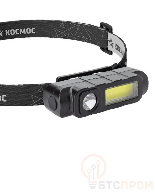 Фонарь аккумуляторный налобный 1Вт LED+3Вт COB LED Li-ion 18650 800мА.ч корпус ABS-пластик USB-шнур регулируемый эласт. ремешок КОСМОС KOC510Lit