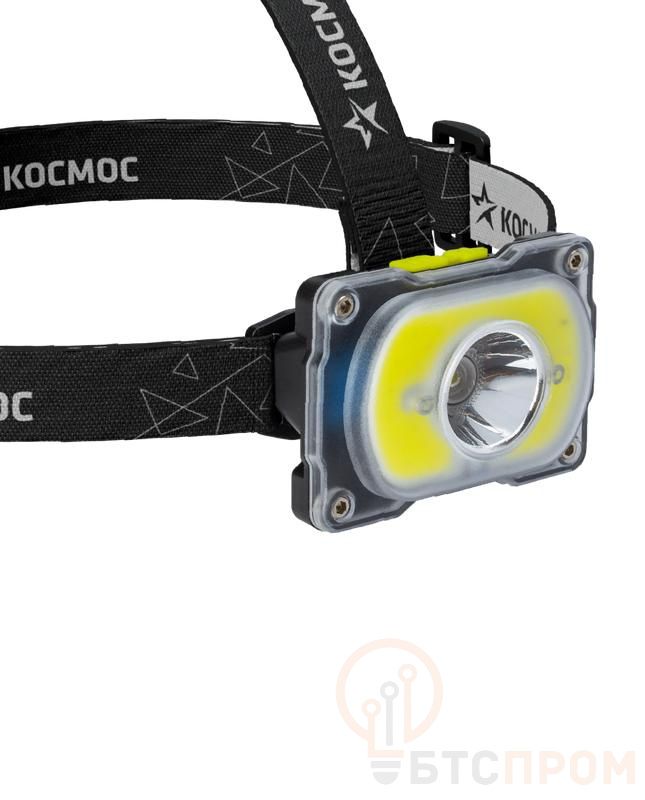 Фонарь аккумуляторный налобный 3Вт XPE LED+5Вт COB LED Li-ion 18650 1200мА.ч корпус ABS-пластик индикатор уровня заряда USB-шнур type C регулируемый эласт. ремешок КОСМОС KOC507Lit