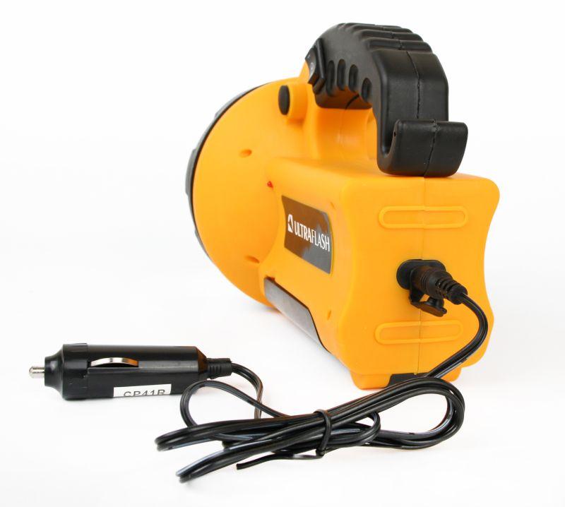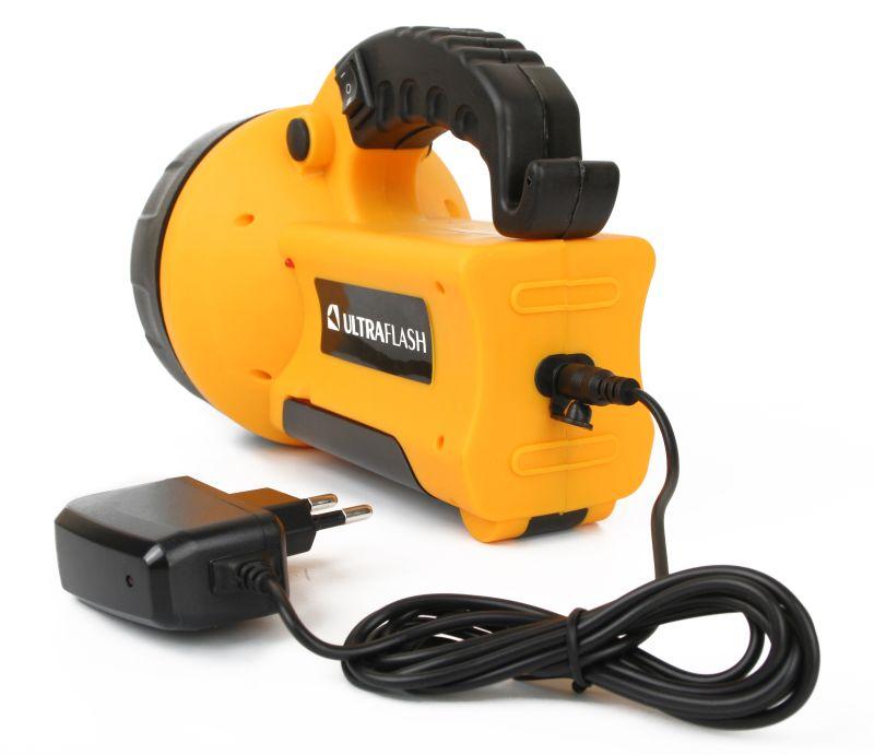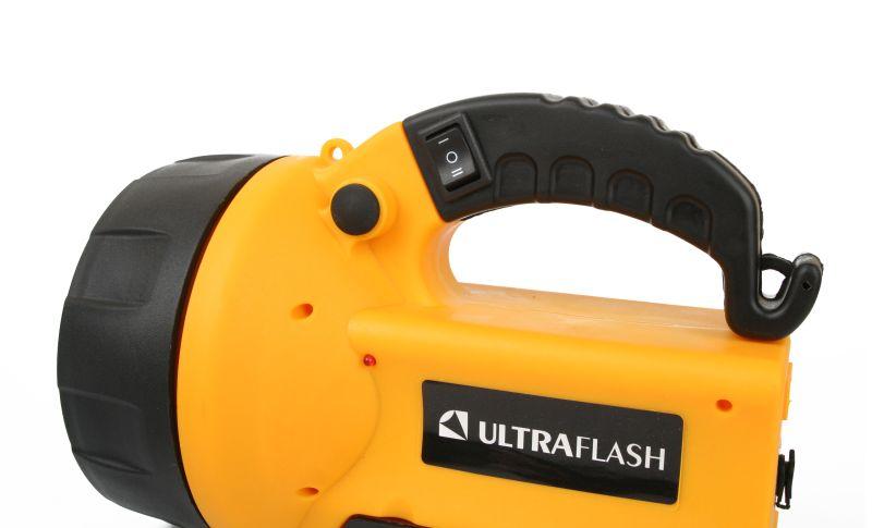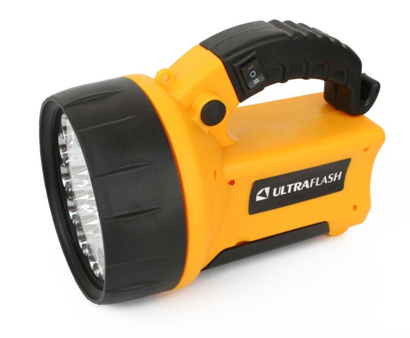 Фонарь Ultraflash электрический светодиодный аккумуляторный. Цвет корпуса - жёлтый с черным. Материал корпуса - пластик. Источники света: 19 светодиодов со световым потоком 70 люмен - в отражателе, 8 светодиодов в поворотном плафоне, Дистанция освещения - до 30 метров. Дополнительное освещение: поворотный плафон с 8 светодиодами - для использования в качестве настольного светильника. Два режима работы. Выключатель - тумблер двухпозиционный. Время работы при полностью заряженном аккумуляторе: осветительный блок с 19 светодиодами - до 8 часов, 8 светодиодов в поворотном плафоне - до 9 часов. Время заряда - 15 часов. Комплектация: фонарь, свинцово-кислотный аккумулятор с напряжением 4 В емкостью 2 А-ч, сетевой адаптер ~220 вольт и автомобильный адаптер DC 12 вольт для заряда, поворотный плафон, ремешок для переноски, инструкция, упаковка. Степень пыле-влаго-защиты IP44. Упаковка - коробка. Максимальный линейный размер фонаря 18 см. Размер упаковки 13 см x 15,8 см x 22 см. Вес без упаковки 0,75 кг. Вес с упаковкой 0,8 кг.