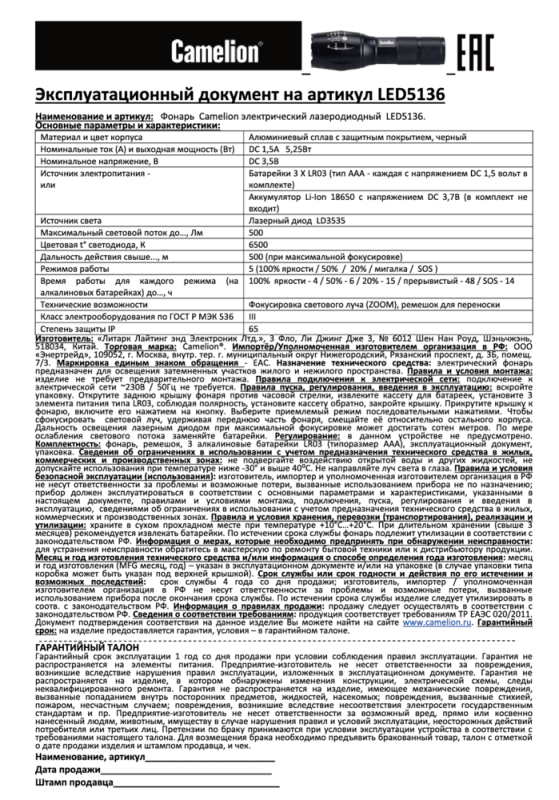 Фонарь Camelion электрический светодиодный. Цвет корпуса: матовый черный. Работает от батареек 3xLR03 (в комплекте) или от аккумулятора 18650 (не входит в комплект). Материал корпуса - алюминиевый сплав 6061 / Т6 с анодированным защитным покрытием. Источник света - светодиод XML-T6 с потребляемой мощностью 10 Вт с цветовой температурой 6500К, максимальный световой поток 500 люмен. Универсальность работы: дальний + ближний свет + энергосберегающие режимы. Дистанция освещения при максимальной фокусировке светового луча - до 400 метров. Пять режимов работы - 100% / 50% / 20% / МИГАЮЩИЙ / SOS. Выключатель - пятипозиционный кнопочного типа (с защитной резиновой накладкой) в задней части фонаря. Время работы при использовании алкалиновых батареек: режим 100% - до 4 часов, режим 50% - до 6 часов, режим 20% мощности - до 15 часов, мигающий режим - до 48 часов; SOS - до 14 часов. Переменный фокус (ZOOM), регулируемый сдвигом передней части фонаря. Комплектация: фонарь, ремешок для переноски, батарейки 3 x LR03 Camelion Plus Alkaline, инструкция, упаковка. Степень пыле-влаго-защиты IP65. Упаковка: открывающийся двойной блистер - капсула. Максимальный линейный размер фонаря 13,6 см. Размер упаковки 6 см x 12 см x 26 см. Вес без упаковки 0,183 кг. Вес в упаковке 0,258 кг.