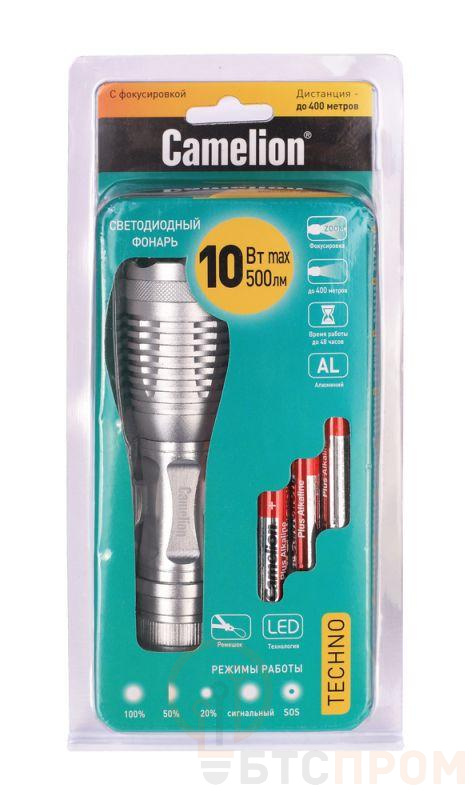 Фонарь Camelion электрический светодиодный. Цвет корпуса - титан. Работает от батареек 3xLR03 (в комплекте) или от аккумулятора 18650 (не входит в комплект). Материал корпуса - алюминиевый сплав 6061 / Т6 с анодированным защитным покрытием. Источник света - светодиод XML-T6 с потребляемой мощностью 10 Вт с цветовой температурой 6500К, максимальный световой поток 500 люмен. Универсальность работы: дальний + ближний свет + энергосберегающие режимы. Дистанция освещения при максимальной фокусировке светового луча - до 400 метров. Пять режимов работы - 100% / 50% / 20% / МИГАЮЩИЙ / SOS. Выключатель - пятипозиционный кнопочного типа (с защитной резиновой накладкой) в задней части фонаря. Время работы при использовании алкалиновых батареек: режим 100% - до 4 часов, режим 50% - до 6 часов, режим 20% мощности - до 15 часов, мигающий режим - до 48 часов; SOS - до 14 часов. Переменный фокус (ZOOM), регулируемый сдвигом передней части фонаря. Комплектация: фонарь, ремешок для переноски, батарейки 3 x LR03 Camelion Plus Alkaline, инструкция, упаковка. Степень пыле-влаго-защиты IP65. Упаковка: открывающийся двойной блистер - капсула. Максимальный линейный размер фонаря 14,5 см. Размер упаковки 6 см X 12 см x 26 см. Вес без упаковки 0,117 кг. Вес в упаковке 0,248 кг.