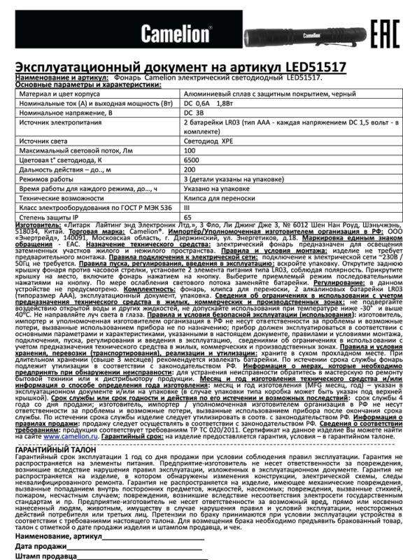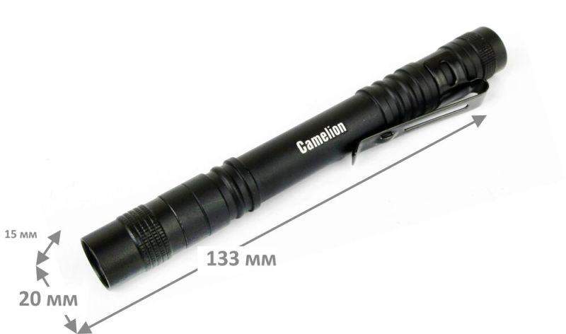Фонарь Camelion электрический светодиодный. Цвет корпуса - черный. Работает от батареек 2xLR03 (входят в комплект). Материал корпуса - алюминиевый сплав 6061 / Т6 с анодированным защитным покрытием. Источник света: 1 светодиод XP-E с потребляемой мощностью 3 Вт с цветовой температурой 6500К, максимальный световой поток 100 люмен. Дистанция освещения- до 200 метров. Три режима работы - 100% / 50% / мигающий режим. Выключатель - трёхпозиционный кнопочного типа (с защитной резиновой накладкой) в задней части фонаря. Время работы при использовании алкалиновых батареек: 100% мощности - до 1,3 часов, 50% мощности - до 2 часов, мигающий режим - более 4 часов. Комплектация: фонарь, клипса, батарейки 2 x LR03 Camelion Plus Alkaline, инструкция, упаковка. Степень пыле-влаго-защиты IP65. Упаковка: открывающийся двойной блистер. Максимальный линейный размер фонаря 13 см. Размер упаковки 2,5 см x 10 см x 18,9 см. Вес без упаковки 0,047 кг. Вес в упаковке 0,065 кг.